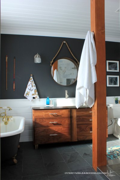 In the master bath, the room looked cold before adding the dark walnut vanity.  After, the room came to life, and contrasted against the darker elements.