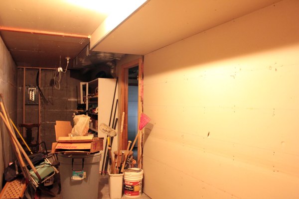 Ben has some wiring to run to get this behemoth hung in the garage.  Actually, we don’t have enough room in the house electrical panel, so Ben is working on adding another to the garage.  The previous owner ran wiring for a future shop/garage and we’re using that.  As if we didn’t have enough irons in the fire, Ben tore down the wall separating the two storage rooms in the garage area.  One month ago, after closing on the house, the storage room looked like this: