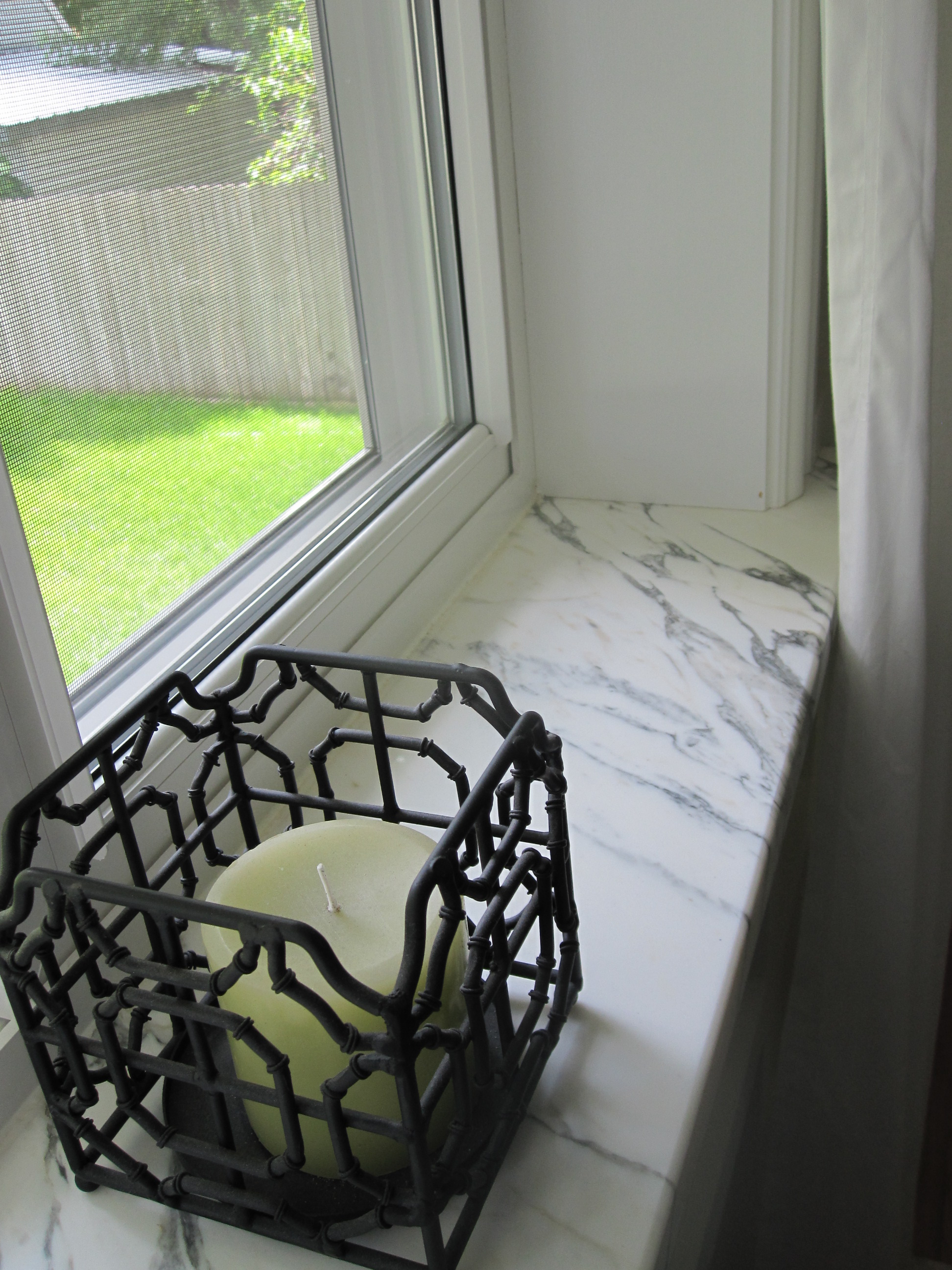 For the bathtub surround, we cut the large floor tiles in half to create a large subway tile pattern. The height of our trim treatment hinged upon the height of the tile and the window sill.