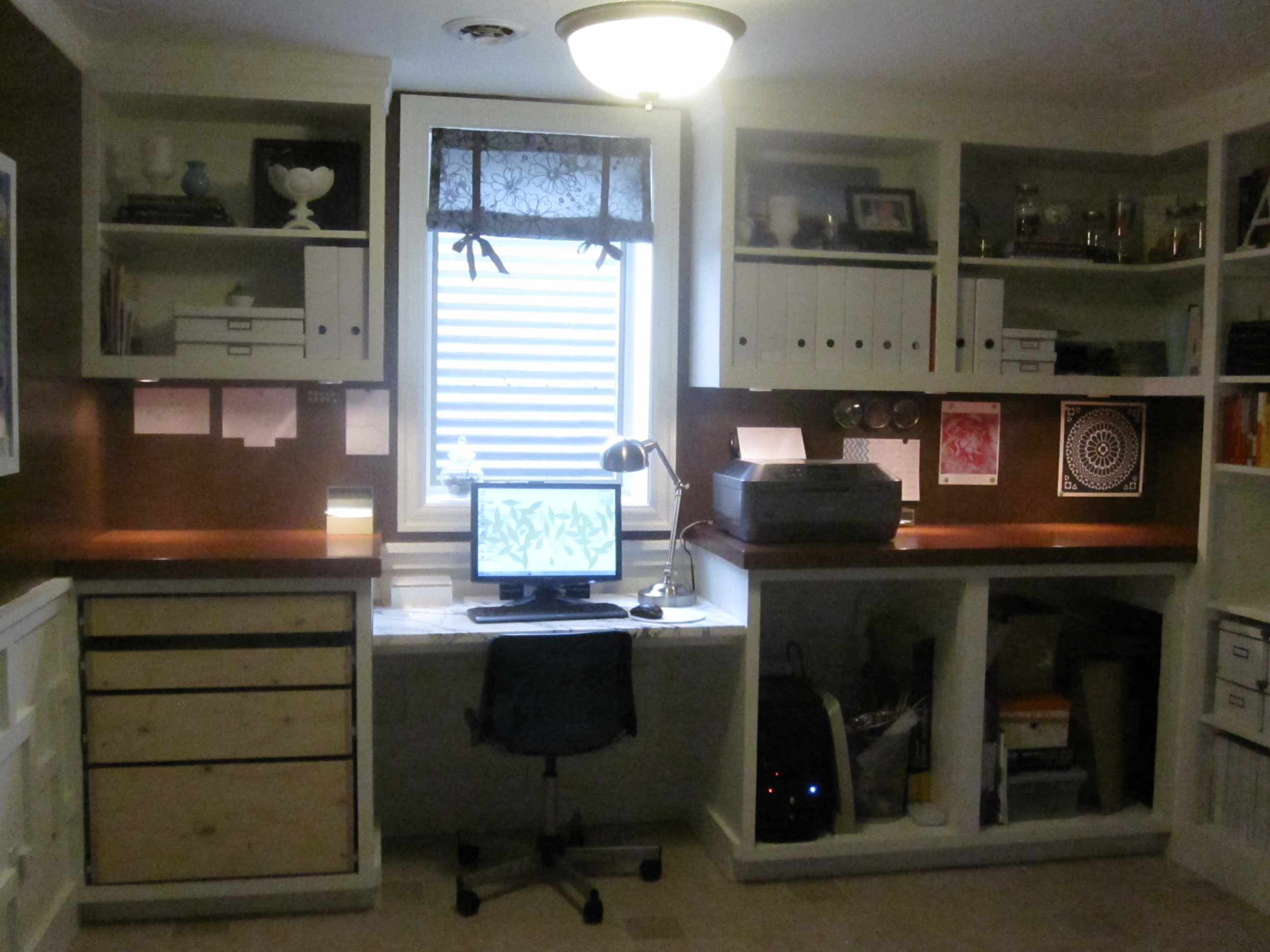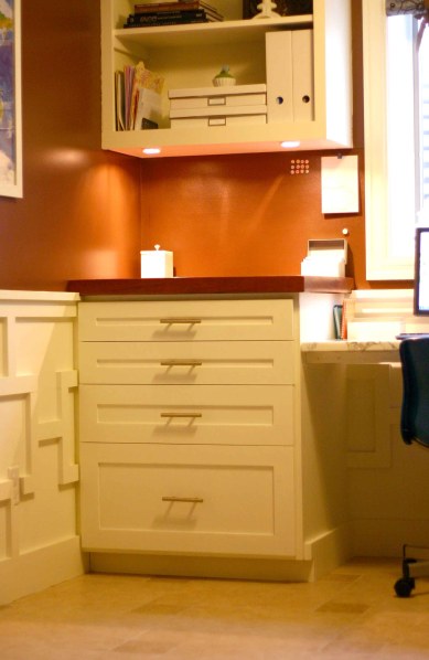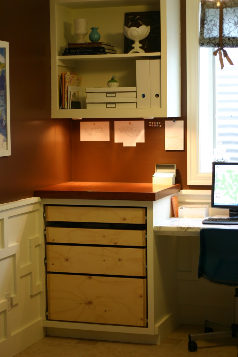 I love the finished, seamless look, especially paired with the connected squares trim pattern. I think the doors and drawers finish off the space perfectly, concealing every ugly, strictly utilitarian office essential. Well, almost every one. We still need to build, paint and install a pull out shelf to set my printer on. It is ugly and needs to be hidden.