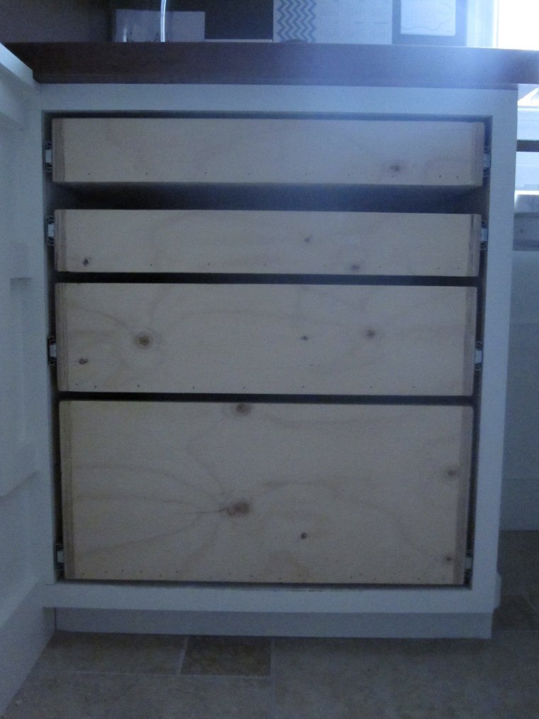 Ben had already installed the drawers, but the drawer fronts couldn’t be built until the drawers were installed. Which means waiting, which I’m not good at. But, Ben built the fronts and it was my turn to prime and paint. A few afternoon naps and three coats of paint later, the fronts were ready. We went from this: