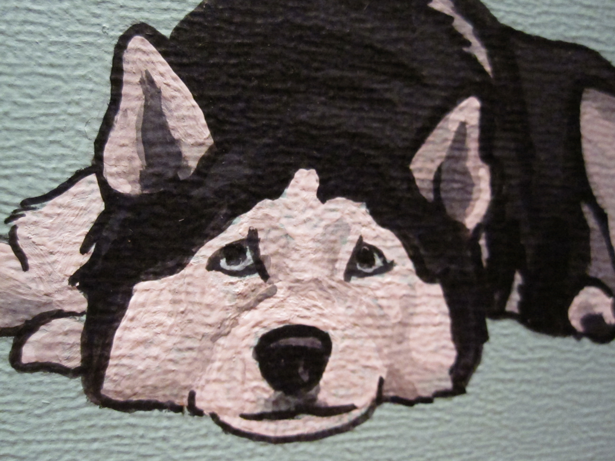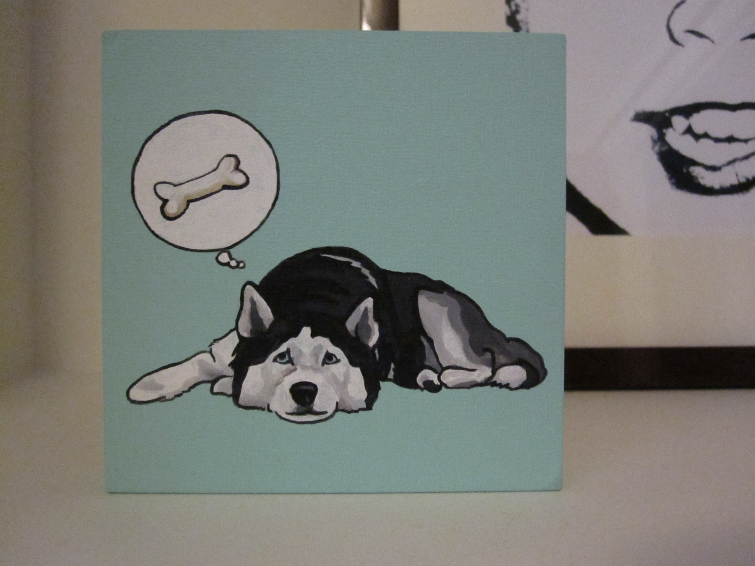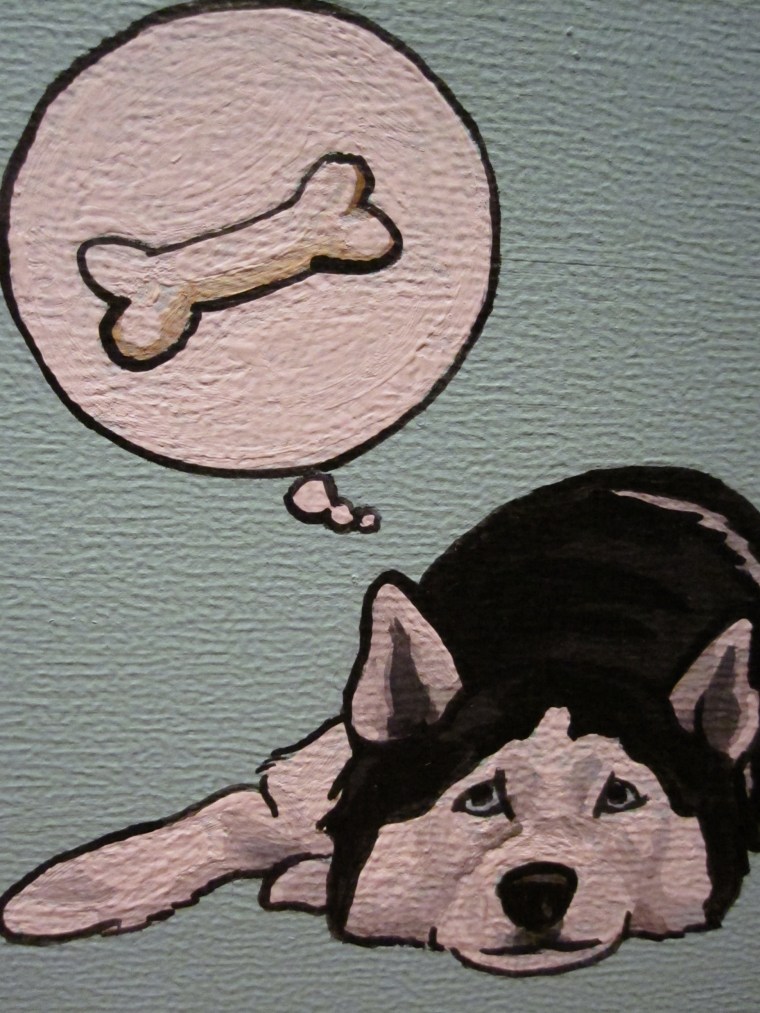 I wanted a blue-ish green background and possibly a thought bubble with a bone or something in it, depending on what Kim thought looked best. I was so excited when she sent an e-mail telling me my painting was (already!) done. Later that afternoon, she sent this picture of the finished design.