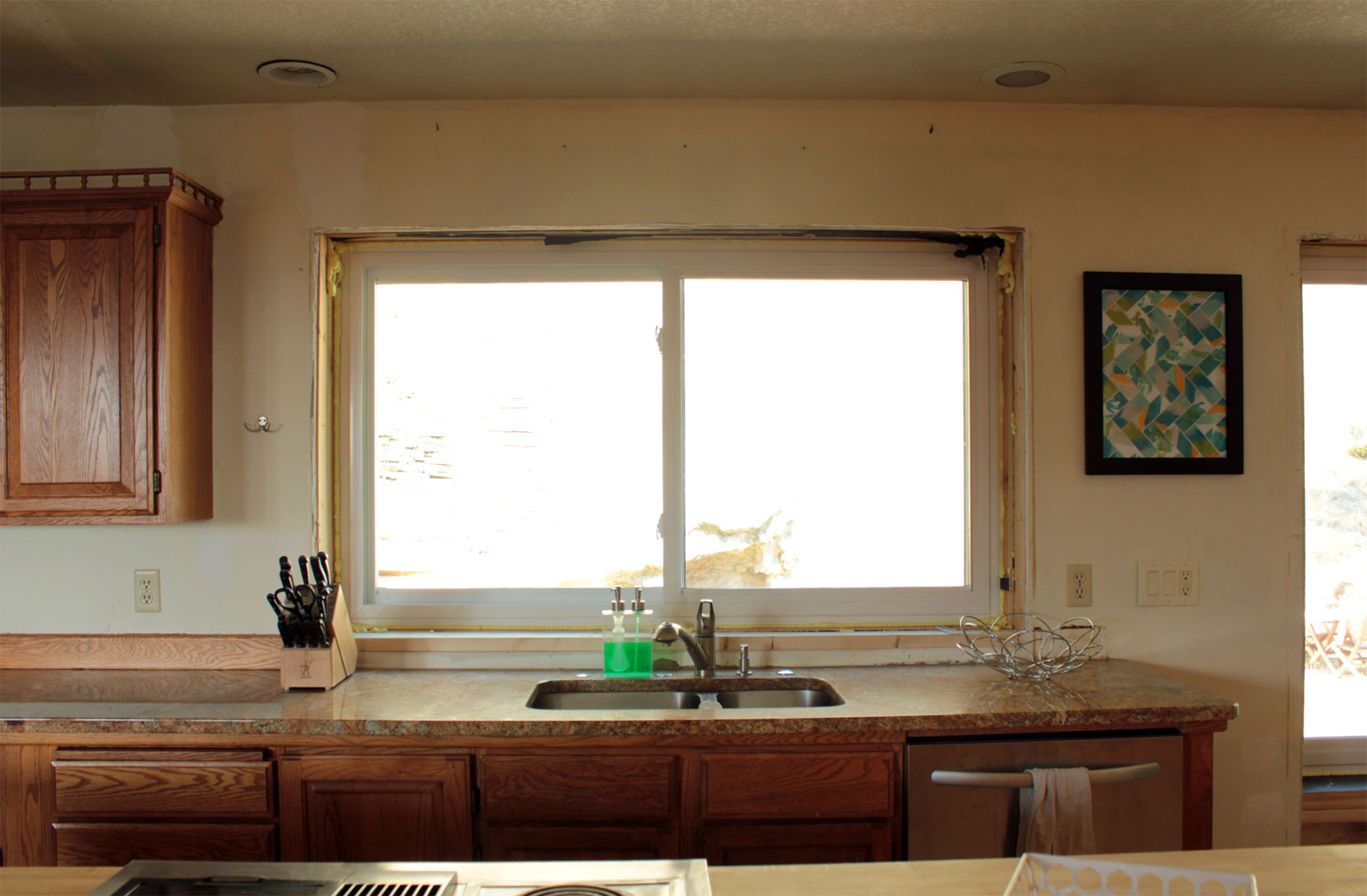 Nope, not pregnant. No new baby here. I’m talking about windows. Now that all most of the windows are in, let’s go inside to take a look at the difference the new windows have made. First, check out the kitchen in all it’s 70’s wallpapered, oak, bay window goodness.