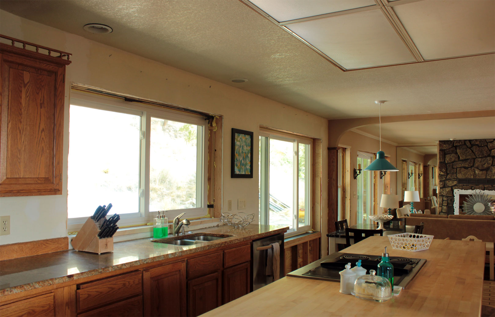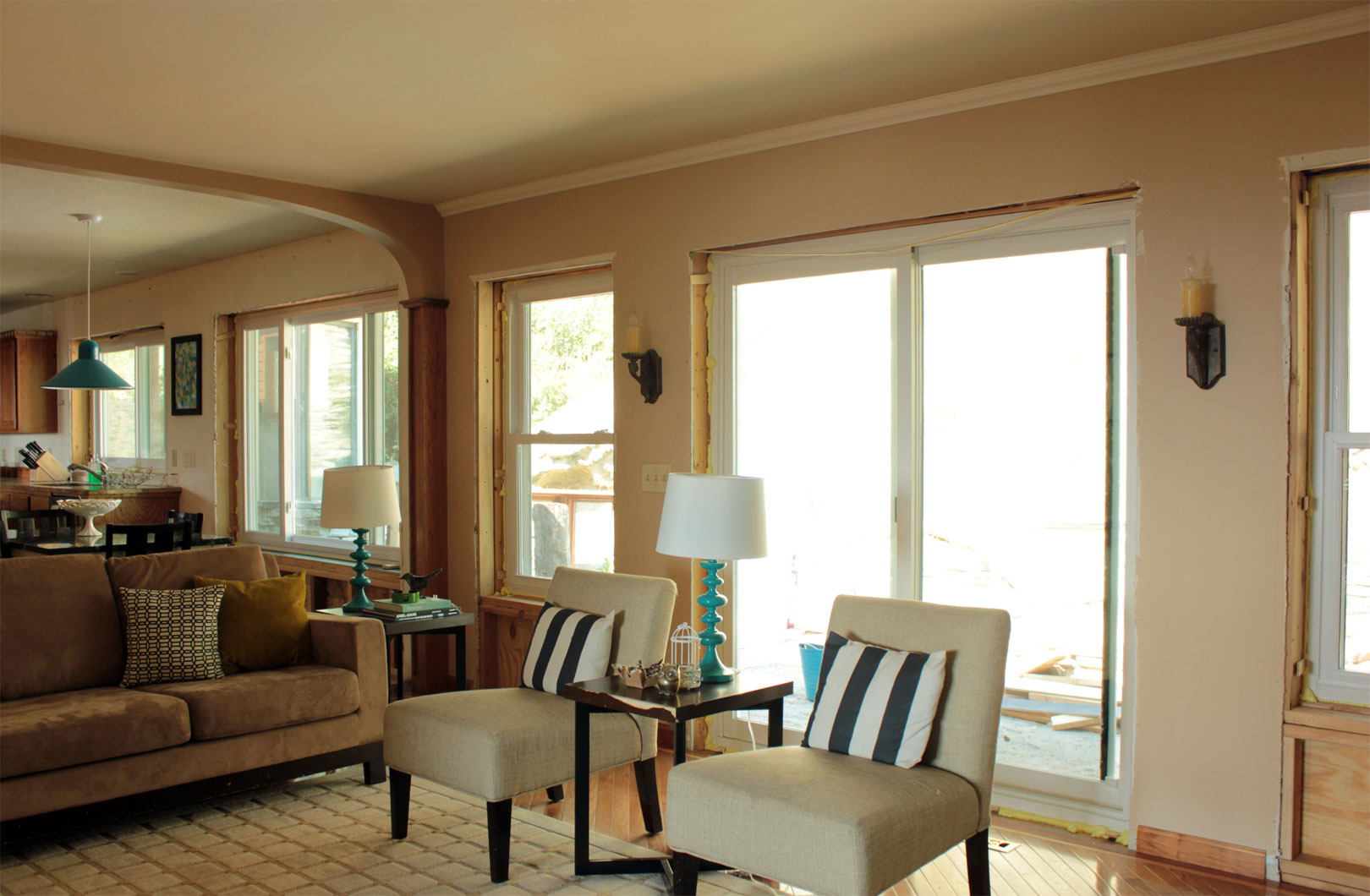 In the family room, we replaced the two stationary side lights with shorter double hung windows. Hooray for air flow. For some reason, I always feel guilty putting furniture in front of windows. So this arrangement works better for us.