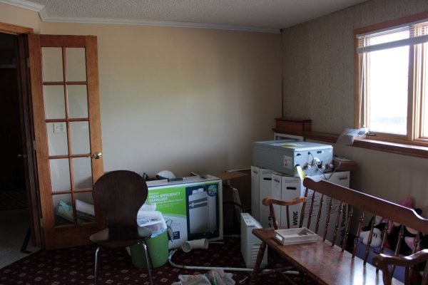 That pretty French door fridge above? I hate it. Ben packed up all the food from the fridge and freezer at the first house on Friday. The fridge contents fit without a problem. However, the two drawer freezer couldn’t hold an entire box of frozen foods. As I tried to cram everything in, getting more and more frustrated while cursing the LG designer I started crying out of annoyance. The stress from packing while watching two little boys and unpacking had gotten the best of me. Luckily, we have space in the utility room for a chest freezer, so Ben bought one yesterday. Rant over. Check out the breakfast nook we’re using as the dining room.