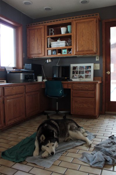 Jack has deemed this her spot, so I tossed a few towels down to keep her cozy until I can make her a little dog bed.
