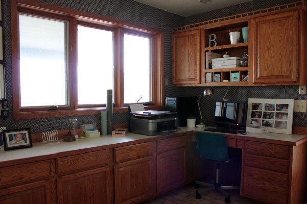 Some day we’ll buy or build a large table to go in here, but that’s not a priority. Right around the corner is my office. I’ve got my craft and shop supplies in the lower cabinets and lots of electronics on the desk top, but it’s totally functional.