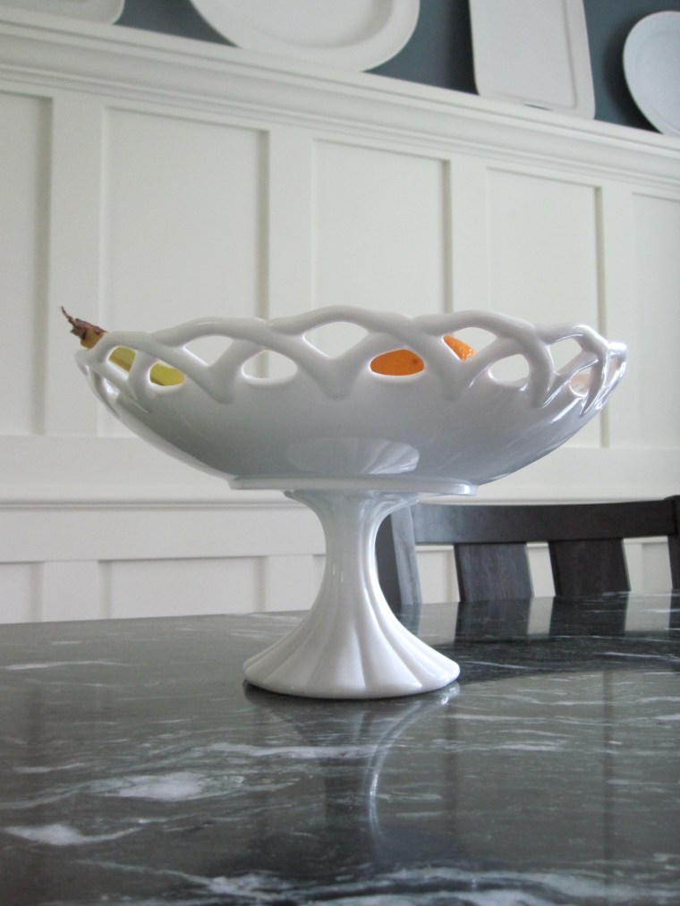Paint: Mistinted version of Restoration Hardware’s Silver Sage (The paint is from Wal Mart and they used the light base. The formula for one gallon is B-37, E-39.5, and T-37. This is the color used in our basement, too. It can look more green in some light) and Behr’s Vermont Cream-both color matched at Wal-Mart Dining Table: DIY Table Chairs: World Market Rug: Flor Curtains: Hand Sewn from Fabric From Hancock Fabrics Fruit Bowl: Thrift Store Plates: Linens N Things and Target Candle Sticks: Target Light Fixture: CB2 Curtain Rod: Wal-Mart Floors: Original Red Oak Hardwood