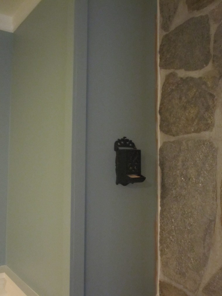 Paint: Restoration Hardware’s Sea Green, color matched to Behr and Behr’s Vermont Cream Headboard: Free from an apartment tenant Floral Bedding: Ross Sheets: Linens N Things Blue King Pillows: TJ Maxx Striped Pillow: Hand Sewn from Fabric from Joann Picture Frame: From my Great Grandma Photo: Forsyth Park Fountain taken on our Honeymoon in Savannah, GA White Nightstand: Built by Ben Lamp: Target Clock: World Market Candle Sconces: Bed, Bath and Beyond Curtains: Wal-Mart Curtain Rod: Target Apothecary Jar of Shells: Michael’s Pendant: DIY with coffee filters