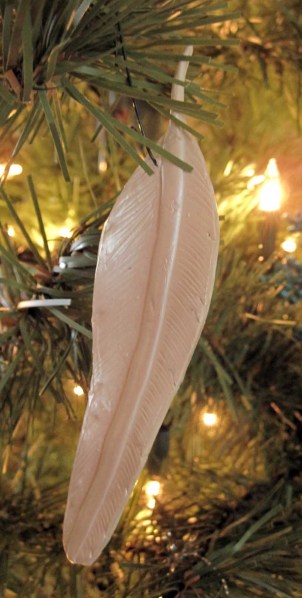 For even more texture, I drew lines with a lead-less pencil, poked a small hole near the top for hanging. To give the faux feathers a more realistic shape, I rolled pieces of aluminum foil and draped the clay over and baked along with the animals.