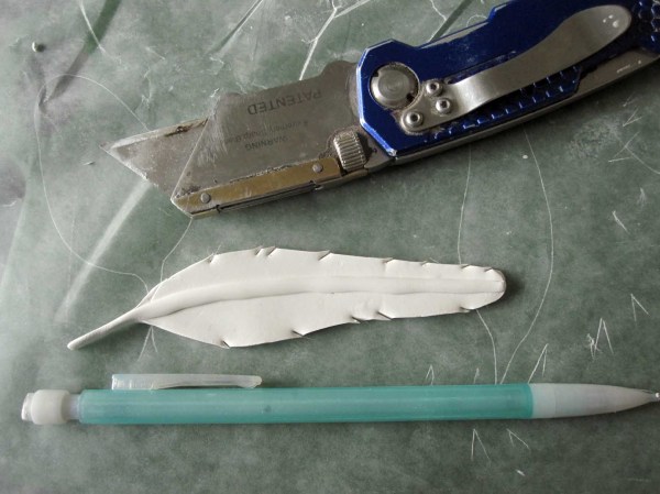 After crafting a few critters, I moved on to feathers. Of course, I had more Pinspiration. I started by rolling the clay thinly on a piece of wax paper. This was so much easier than peeling it off the table. Then I cut a feather shape out of the clay and made a few smaller notches for texture. To make the center support, I rolled a piece of clay into a long, thin strip. After placing it on the feather, I smooshed it own a little and smoothed it out.