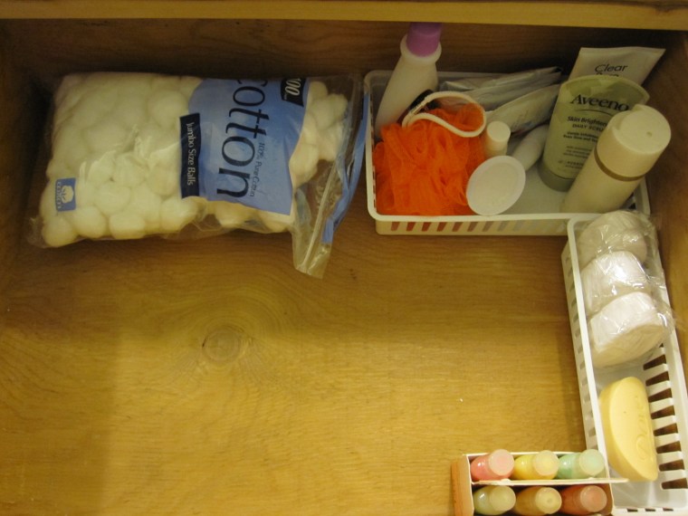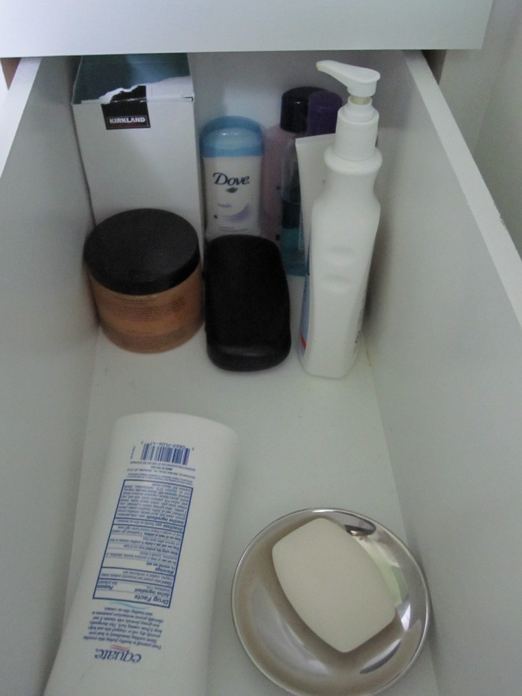 As if cleaning windows and refrigerators wasn’t enough fun, Ben also removed everything from both bathroom drawers, vacuumed and scrubbed the insides. Yes, I am one lucky girl. Then I went through all the contents. I threw some things away, donated others, and organized the rest.