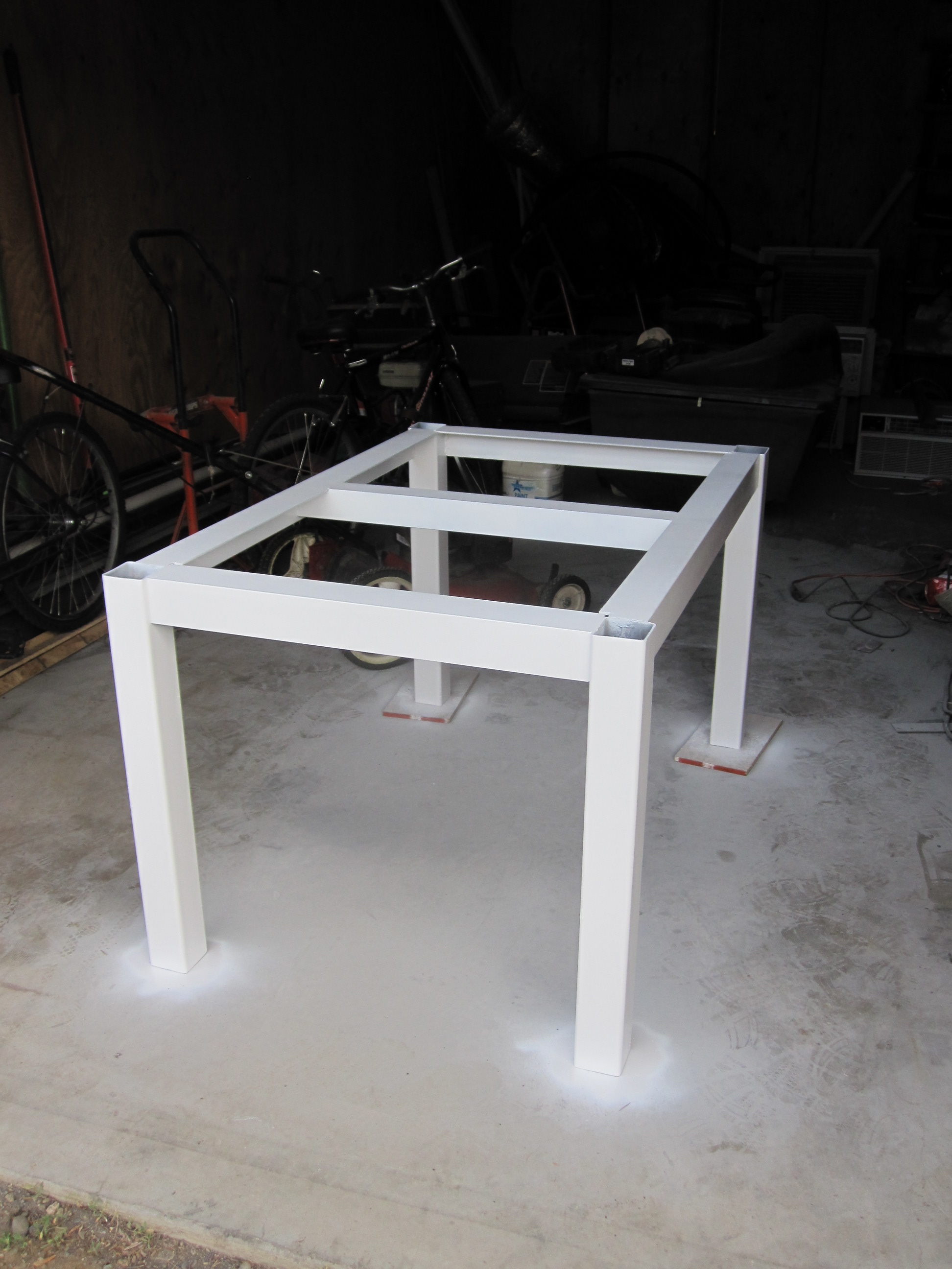 After discussing a new table with Ben and looking around town, the search died; we couldn’t agree on a table. We discussed building a wooden table and painting it white. But how to make it sturdy enough? Back to the drawing board. Then, Ben had a great idea. Why not build the table out of steel? It’s cheap, durable and rigid.
