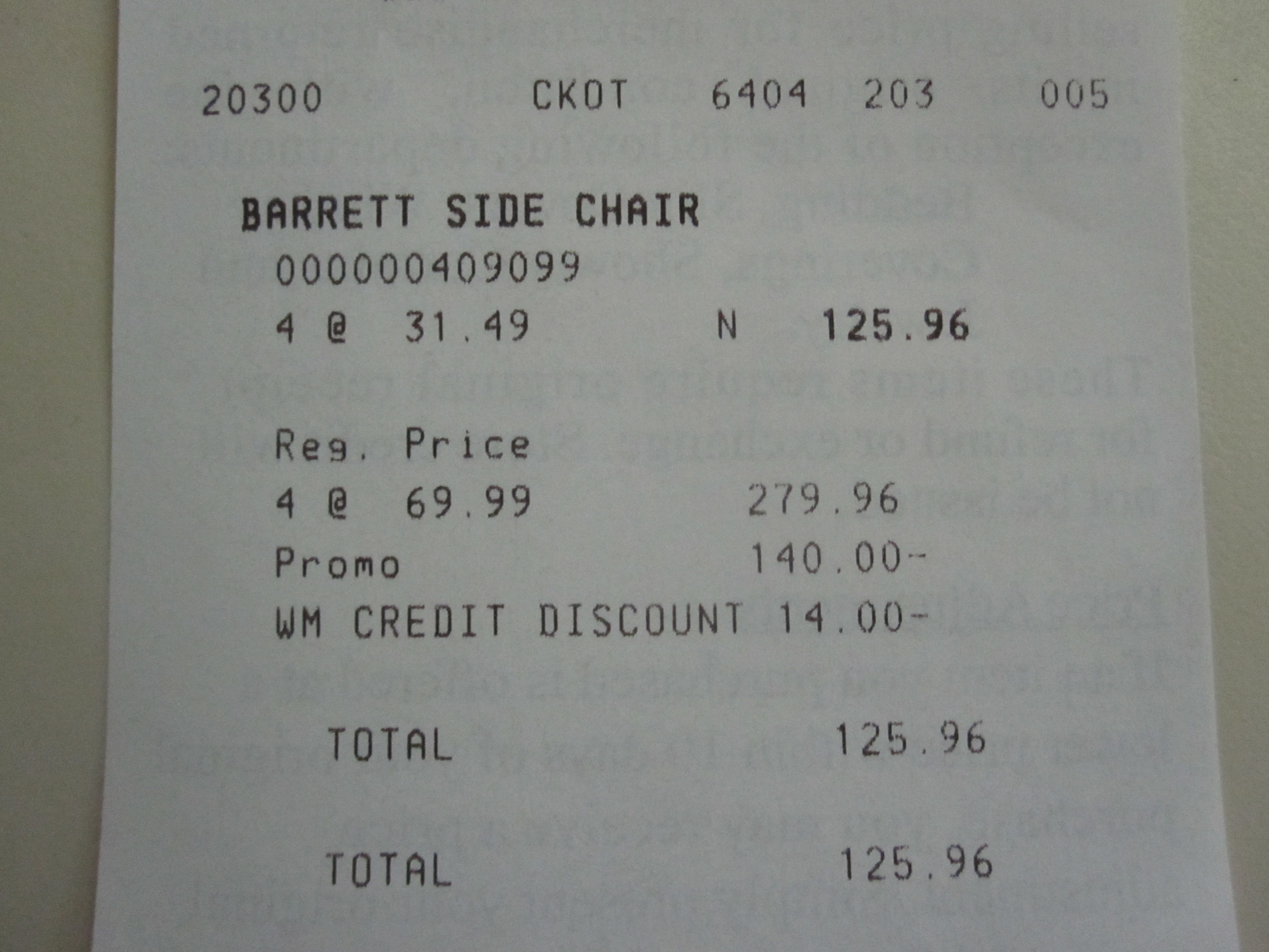 They aren’t quite as good-looking as the Loft chairs, but the price was definitely right and they are nice, solid chairs. The chairs are discounted because they are discontinued. We were sold-we bought four. World Market offers 10% off your entire purchase if you open a World Market credit card, so we got an additional $14.00 off! Here’s our receipt. I love when stores show the amount you’ve saved. I really love when the amount saved is more than the amount spent. Check it out: