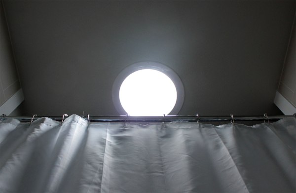 Ben hung the light last night using a basic ceiling canopy. The plain shade was boring, so I taped two pieces of wood veneer around the top and bottom.