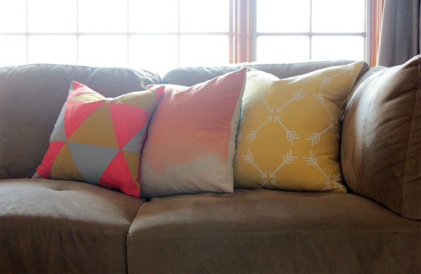 For the other side of the couch, I started dip dyed a piece of natural colored canvas in a tangerine dye bath. Just a simple dip and wiggling to get an ombre-ish pillow.