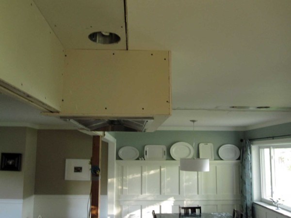 In all honestly, I was a little shocked at how deep it was. In the week since we took the cabinets and soffit down, I had gotten used to the open feel. And I really liked how much more open everything was after knocking down the wall. So this seemed heavier than I anticipated. But, I was so happy the vent hood only drops 1/2 inch below the sheet rock of the support beam.