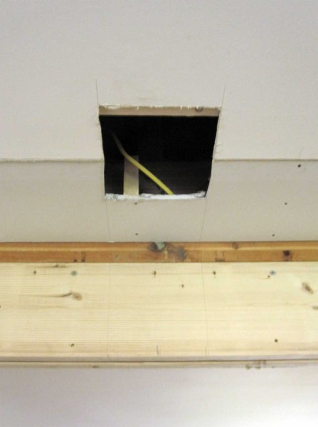 With everything wired up, Ben covered the box with sheet rock. Now, our giant hole in the wall looks something like this.