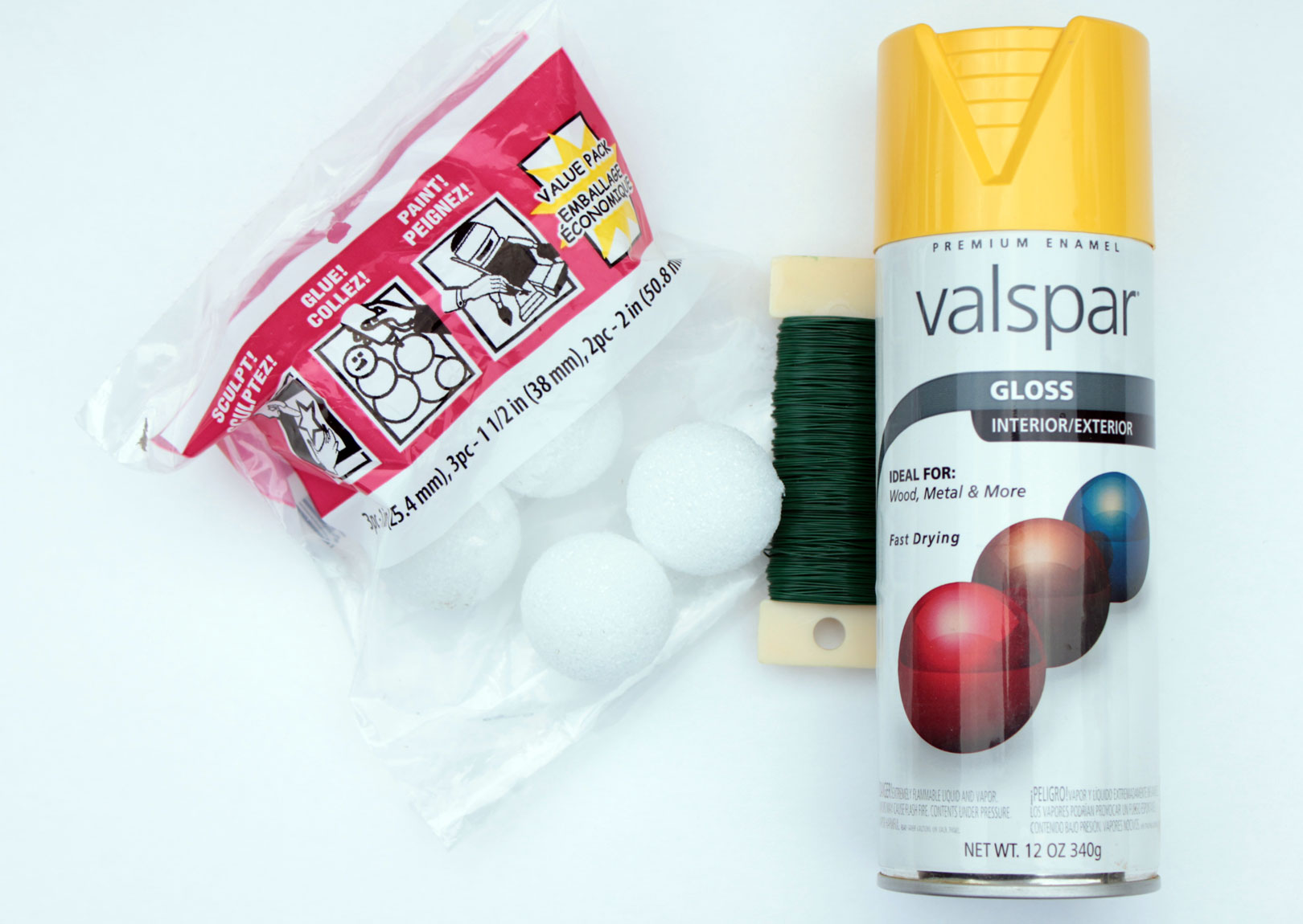 Using small foam balls (from Dollar Tree), green floral wire, paper clips (not pictured), and sunny yellow spray paint, I got to work.